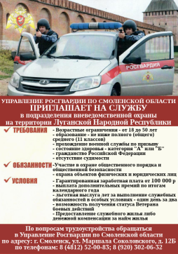 Управление Росгвардии по Смоленской области приглашает на службу в подразделения вневедомственной охраны на территории Луганской Народной Республики.